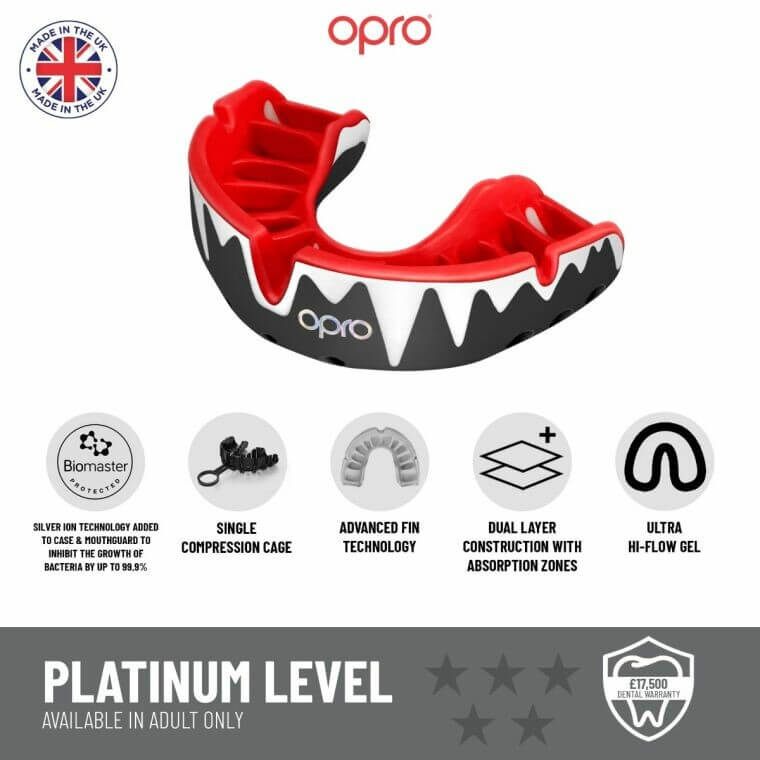 Obtenga la protección más avanzada con el protector bucal Platinum de OPRO: nivel 5 en la gama Self-Fit. Comodidad superior, con un ajuste seguro y protegido. Adecuado para todos los deportes de contacto, incluidos el rugby, el hockey, las artes marciales mixtas, el boxeo y el fútbol americano.