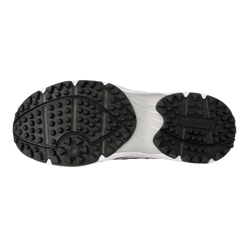 Base de goma que da amortiguación, y tanto en el talón como en la punta protecciones con plástico de alto impacto para reducir los golpes por la bocha o palos. Los tapones son especiales para el sintético de arena o agua, brindan agarre y estabilidad en la pisada.